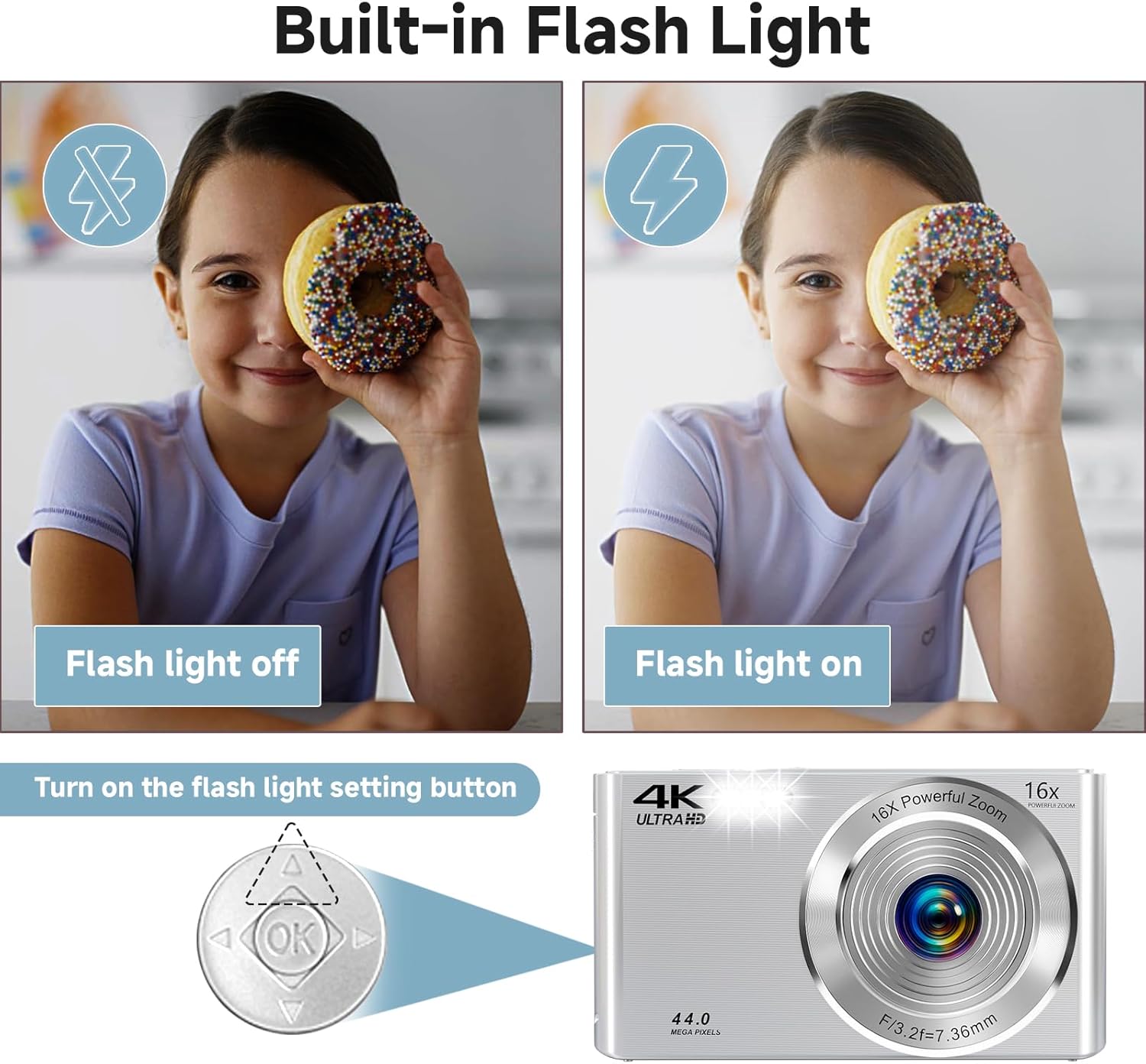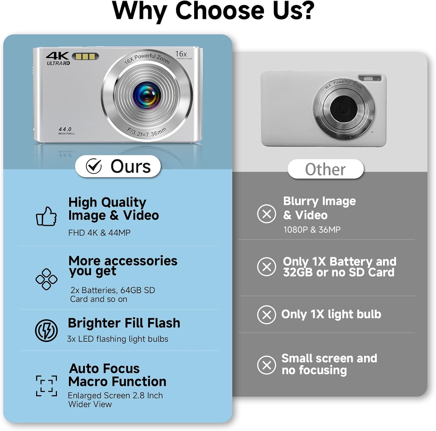 FHD 4K 44MP Camera with 64GB SD Card:The digital camera for kids takes clear 44MP photos and 4K FHD videos. It features a large 2.8 inch UHD display for easy viewing and includes a 64GB SD card, providing plenty of space to save all their favorite moments